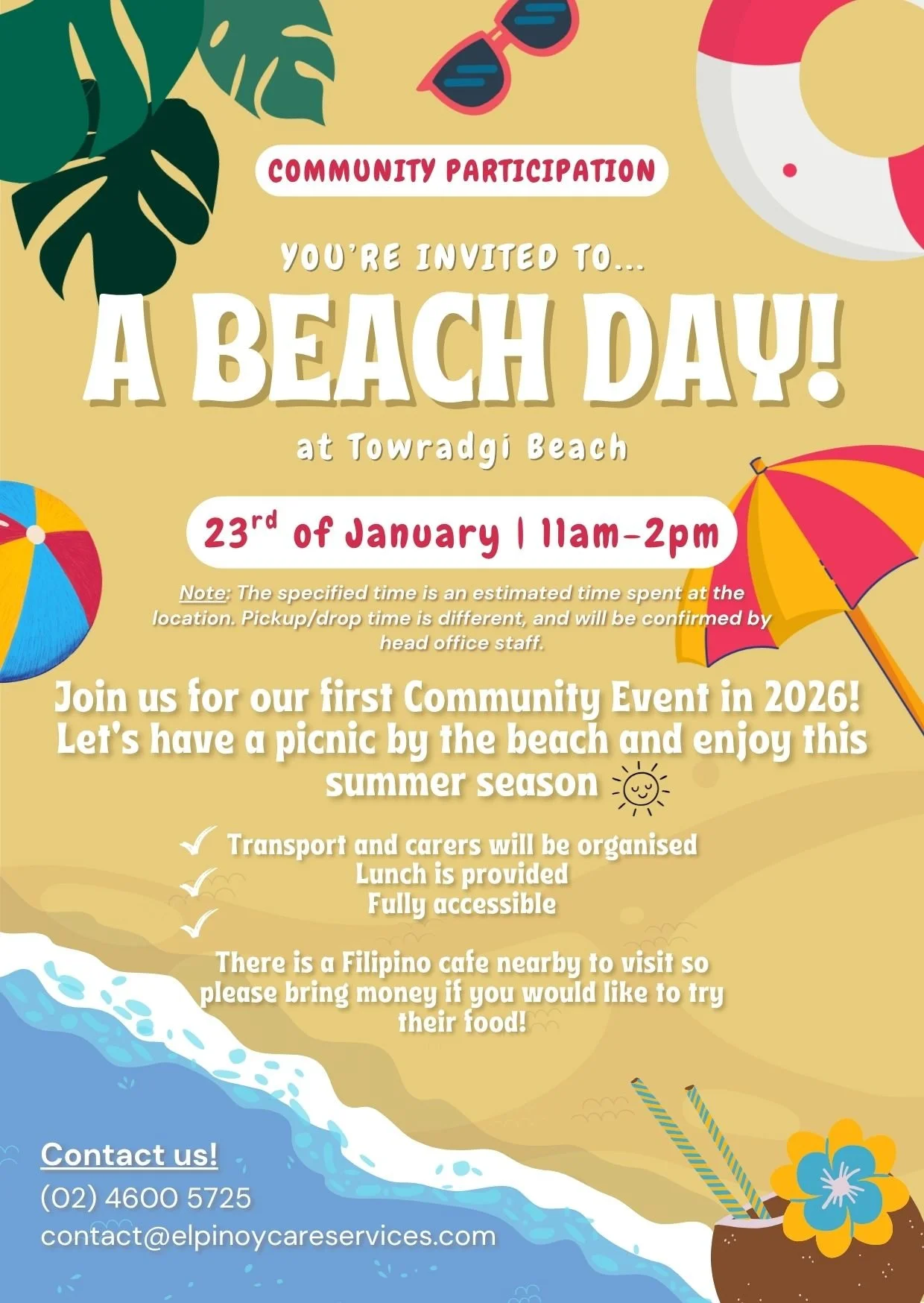 Join us for a relaxing and fun-filled Beach Day! Soak up the sunshine, feel the sand between your toes, and enjoy the refreshing ocean breeze. There’ll be plenty of time to swim, play beach games, share good food, and unwind with great company. Whether you're up for a splash in the water or simply want to relax by the shore, there’s something for everyone. Bring your sunscreen, your favorite snacks, and your beach spirit—we can’t wait to spend the day with you!